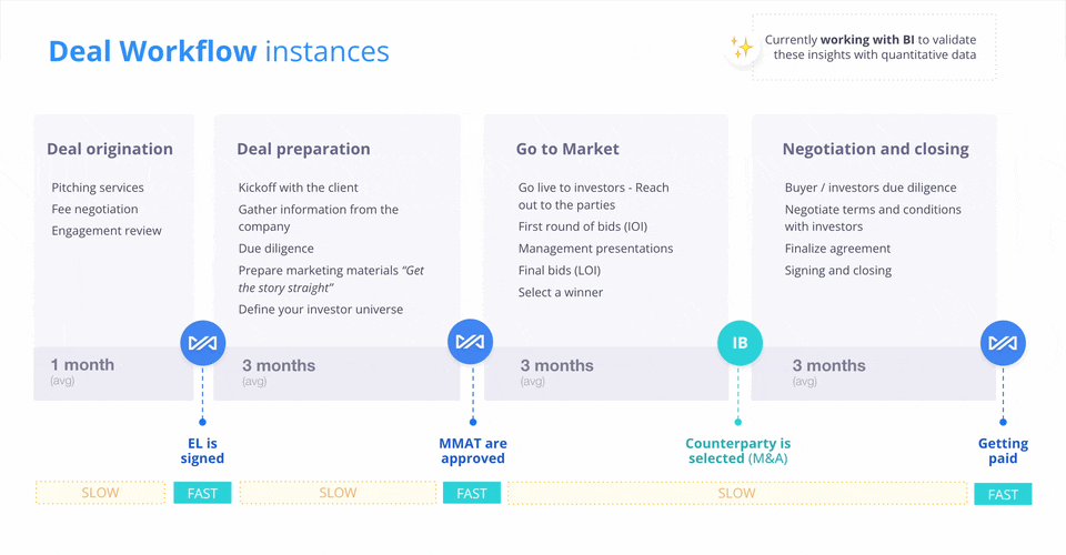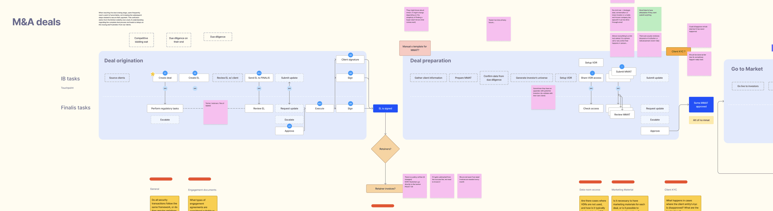 We conducted in-depth process reviews with the service designer, shadowing internal teams and mapping the end-to-end compliance and back-office workflows. This helped us spot friction points, gaps in documentation requirements, and inconsistencies in how information was updated across systems. In parallel, we ran focused interviews to dive deeper into the key pain points and to understand the deal lifecycle from the end-user perspective, which we later compared against the operational steps to reveal misalignments and gaps.